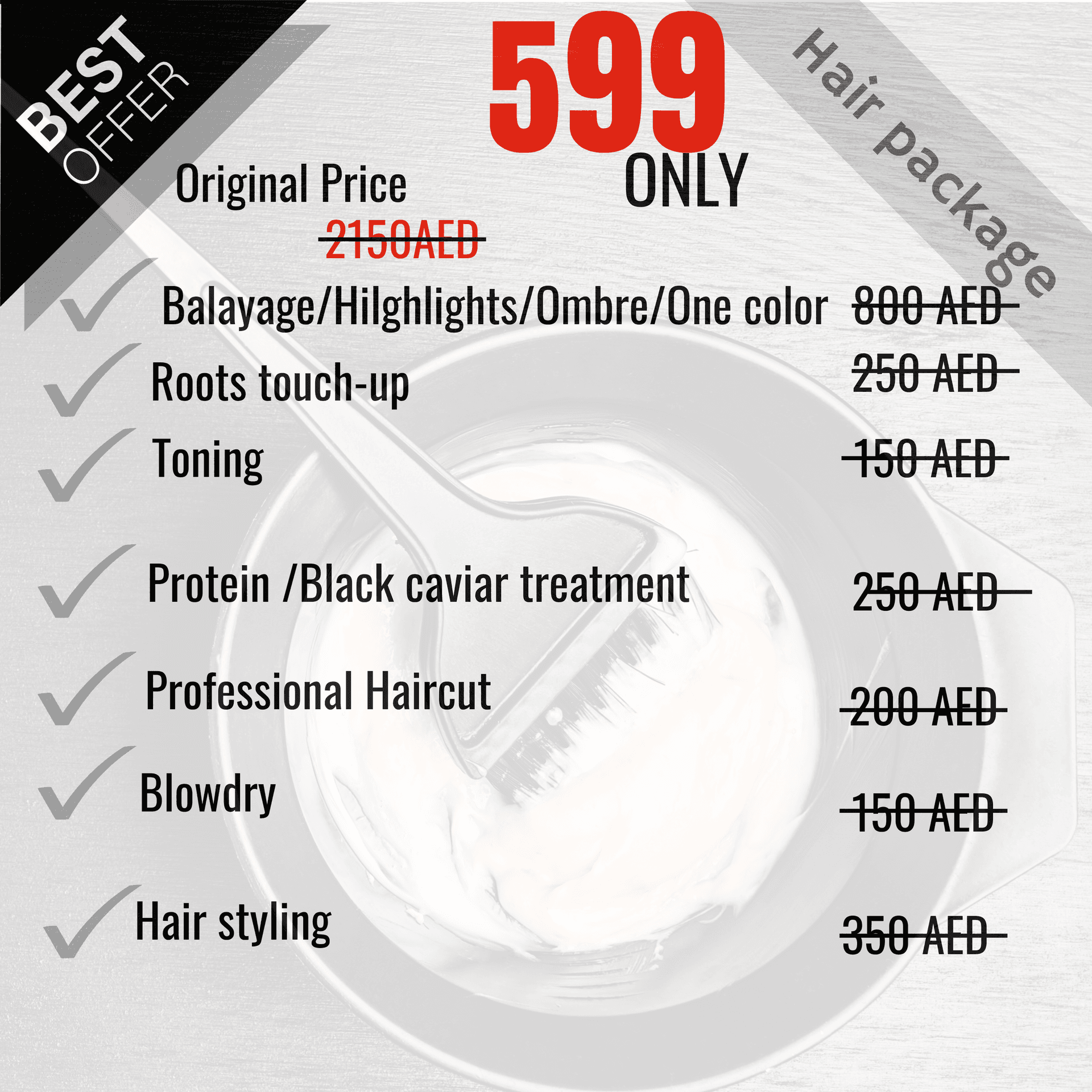 Transform Your Look for Only 599 AED. Balayage / Highlights / Ombre / One Color. Roots Touch-up & Toning. Haircut, Blowdry & Styling. Don't miss this limited-time deal - savings in one package!